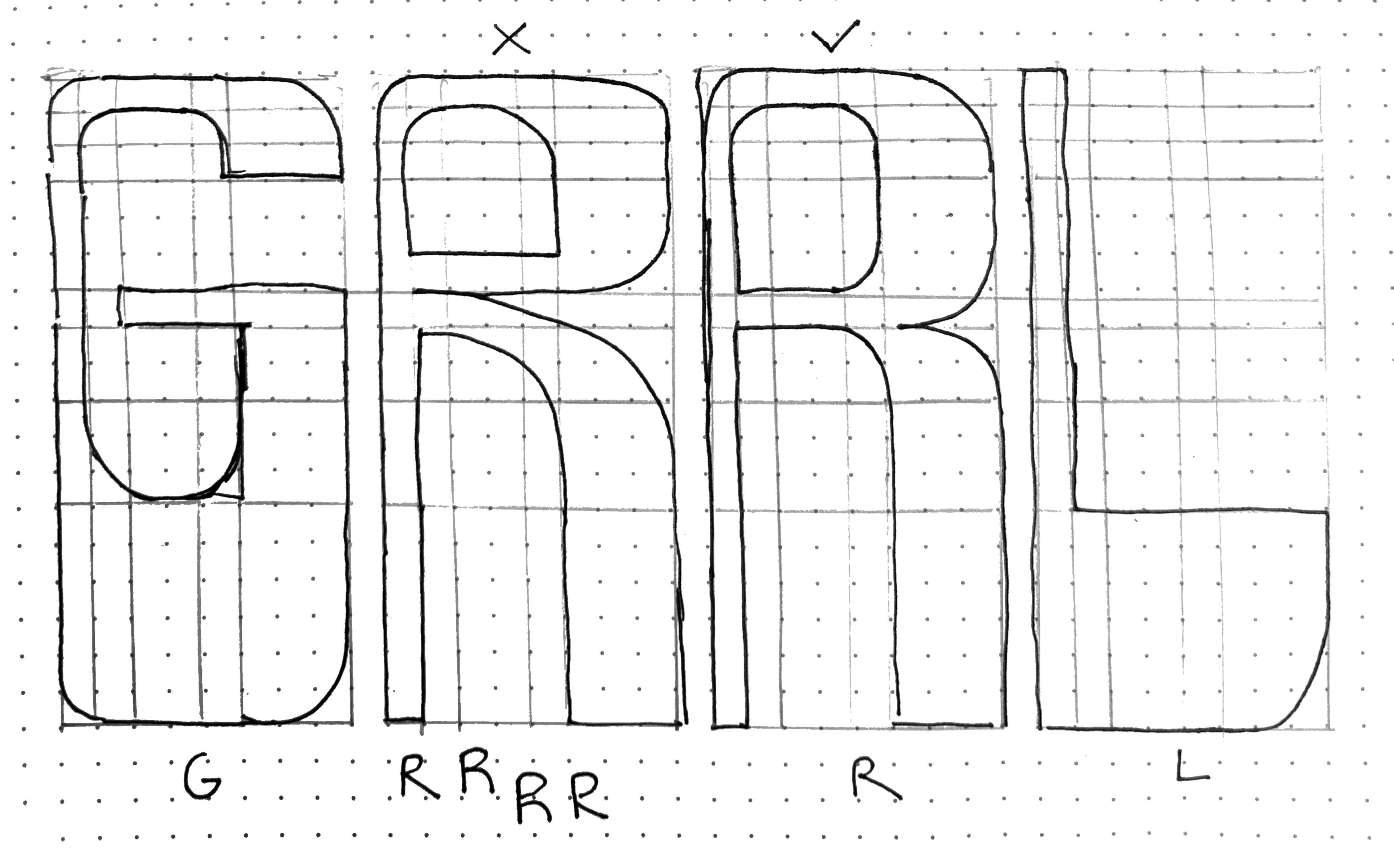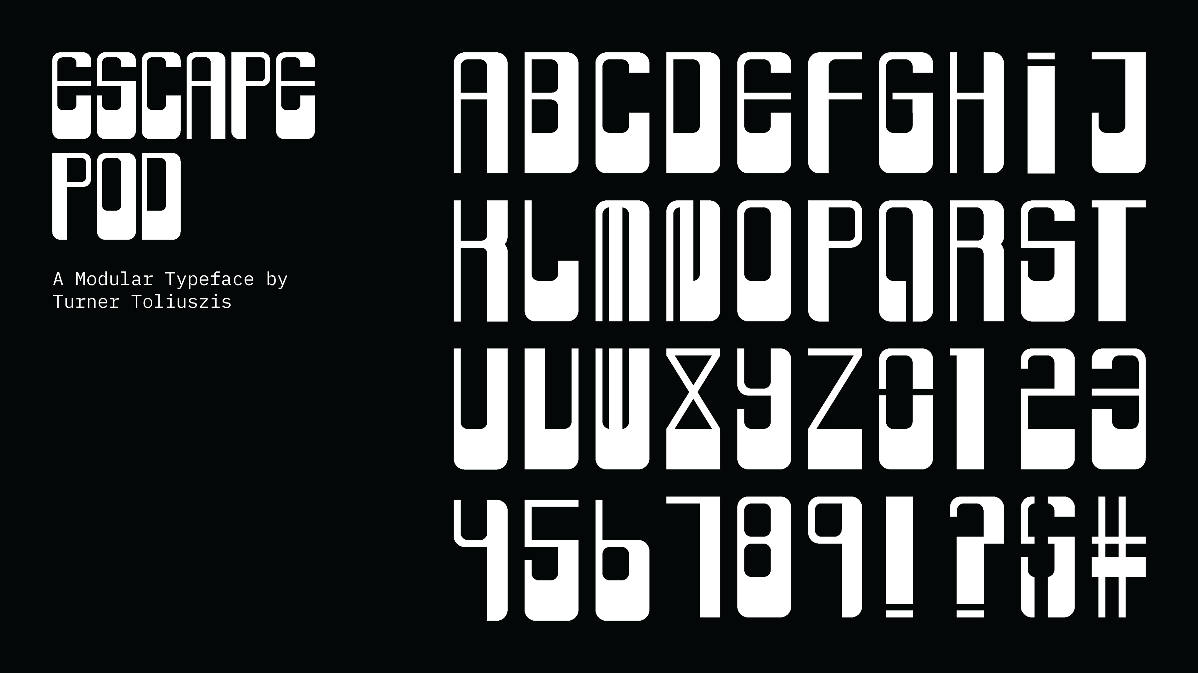 To create Escape Pod, I developed a modular grid which would apply to every letterform. This allowed me to apply a set of consistent design rules to each new letter. I sketched a handful of letters on paper before digitizing and making adjustments.