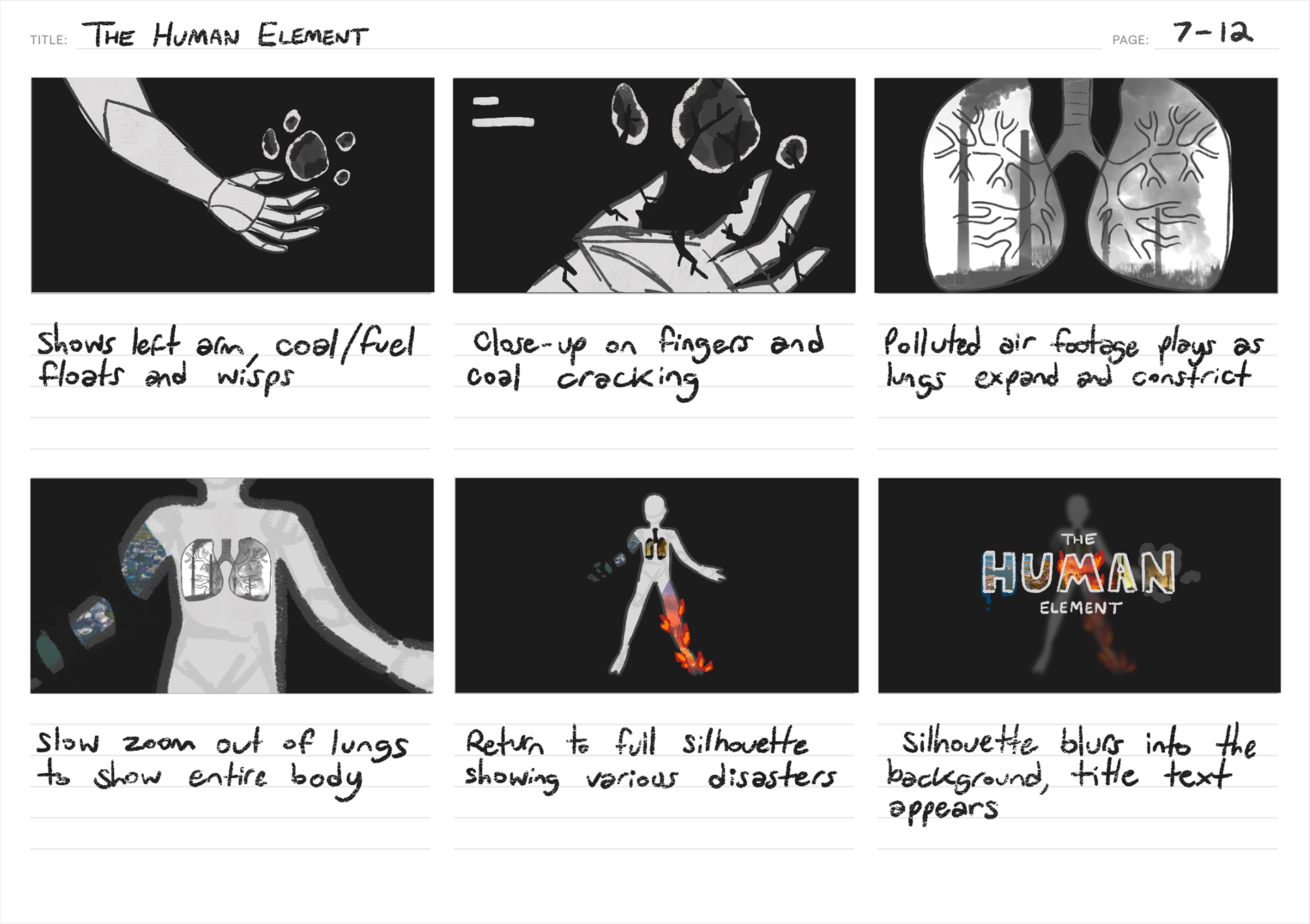 This conceptual title sequence for the documentary 'The Human Element' captures humanity's impact on the environment through photographic and illustrative visuals of the body, natural disasters, and the four classical elements. The sequence is intended to evoke a sense of significance, drama, and tension.